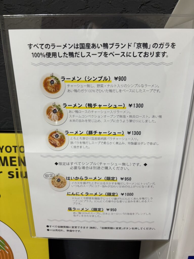 どれも鴨チャーシューと豚チャーシューどちらかのヴァージョンあり(どちらも¥1300)